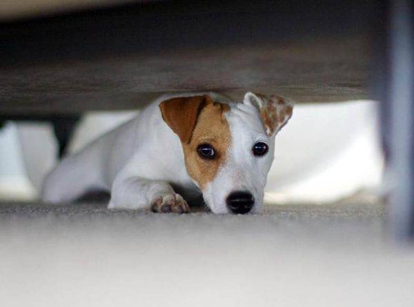 - Страх. Если собака скулит и прячется под диван или в укромный угол, стоит понаблюдать за ней, чтобы понять, что именно вызывает страх: громкие звуки на улице, гроза, строгое обращение или знакомые, которые когда-то проявляли агрессию.