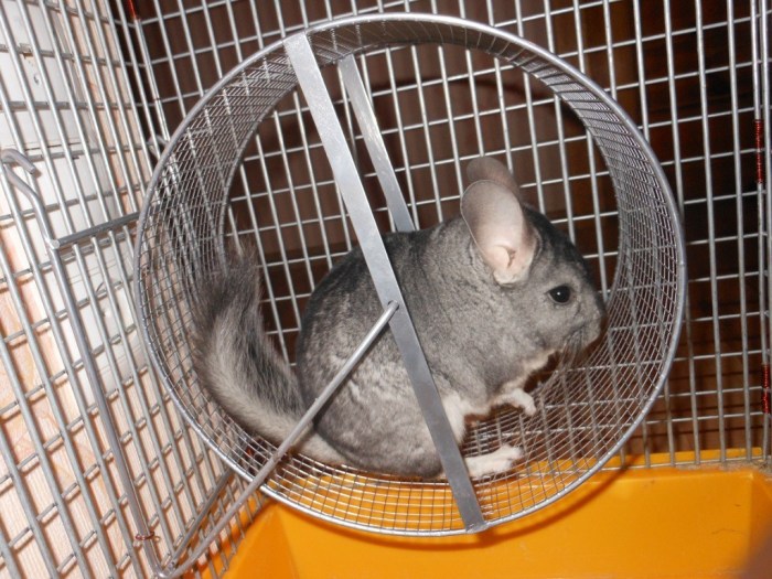Стандартные беговые колёса, предназначенные для хомяков и морских свинок, имеют слишком большие промежутки между прутьями. В процессе активного бега питомец может легко повредить лапку. Существуют цельные деревянные колёса, которые сложно найти, но они идеально подойдут для вашей шиншиллы. Если вы беспокоитесь о недостатке активности вашего любимца, добавьте в клетку трубы и установите несколько дополнительных полок.