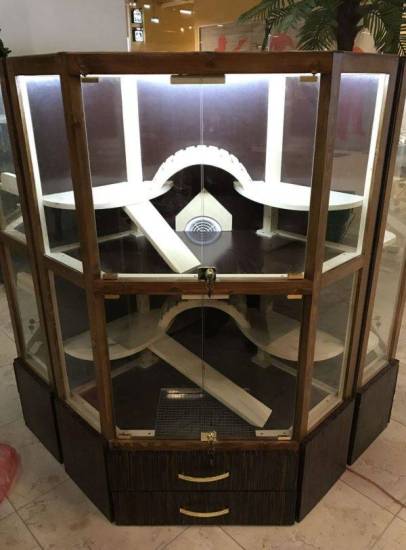 Витрины представляют собой конструкции с деревянным каркасом и стенками, выполненными из стекла и мелкой сетки. Одним из главных достоинств витрины является то, что она эффективно гасит шум, создаваемый питомцами, а также предотвращает разлетание мусора по комнате. Однако у витрины есть и недостатки: ее сложно чистить, деревянный каркас может впитывать посторонние запахи, а стенки и пол подвержены разбуханию от влаги. В связи с этим такое жилище требует периодической замены.