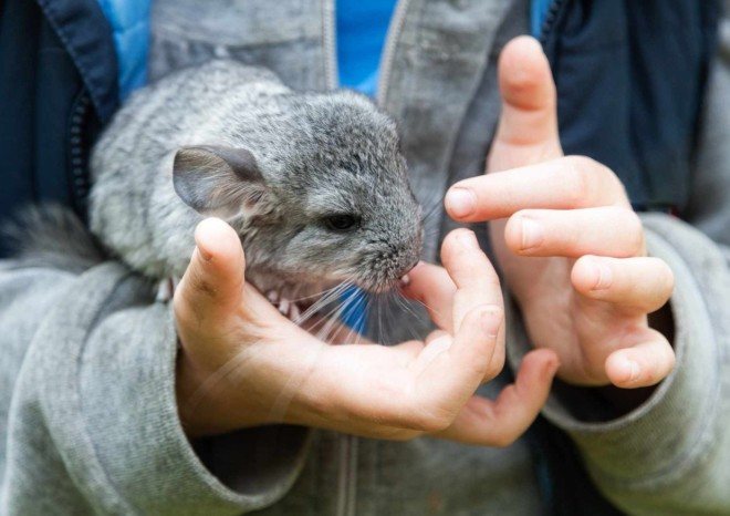 Шиншиллы не любят долго находиться на руках, но с удовольствием позволяют себя почесать.