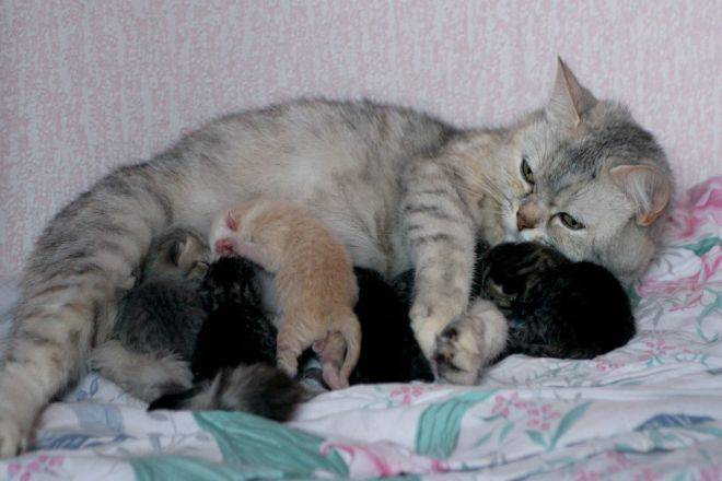 Как- только начинаются схватки, нужно положить ее в подготовленную коробку с чистой пеленкой. Крохи появляются с интервалом 40-60 минут. Котята рождаются в пузыре. Мать разгрызает оболочку и вылизывает детенышей: стимулирует дыхательную функцию новорожденных. После этого кошка перегрызает пуповину. Вышедшую плаценту животное чаще всего съедает.