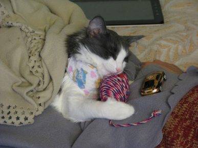 Кроме того, важно организовать для кошки место для отдыха на полу (избегайте возвышенных поверхностей), так как в первые два дня у нее могут возникнуть проблемы с координацией, и у нее не будет сил на прыжки. Если она упадет с дивана, это может привести к разрыву швов. Лучше всего укладывать кошку на правый бок, чтобы не нагружать сердце.
