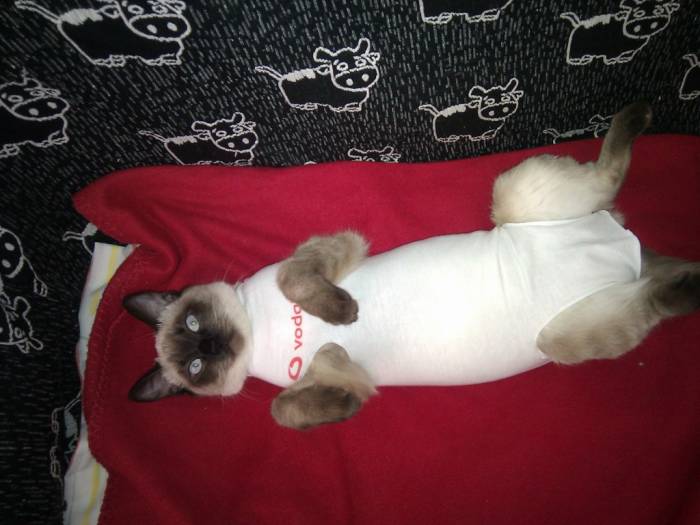 Когда мы забрали нашу кошку из клиники после операции, она была уже в попонке. Реакция на этот аксессуар была весьма забавной — она просто лежала неподвижно. Однако как только мы сняли защитную одежду, она сразу ожила и начала пытаться бегать.