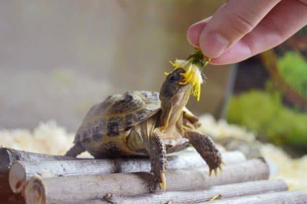 Сухопутные черепахи являются травоядными, поэтому их рацион в основном состоит из растительной пищи, которая составляет около 90%. Около 10% рациона может составлять животная пища с добавлением минерально-витаминных добавок. Кормить черепаху следует мелко нарезанной смесью трав, овощей и фруктов, а также добавлять отруби, соевый шрот, творог, сухие дрожжи, морскую капусту, мясной фарш и вареные яйца.