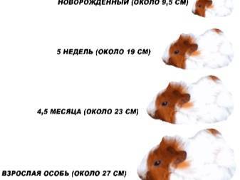 - Размеры (в среднем длина тела взрослой свинки составляет 27–29 см, самки к 1,5 годам обычно весят 0,7-1 кг, а самцы – 1–2 кг; месячная свинка весит около 0,5 кг);