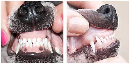 В молочном прикусе нет моляров и крайних премоляров. Разница между молочным набором зубов и постоянным составляет 10 или 14 штук, в зависимости от породы.