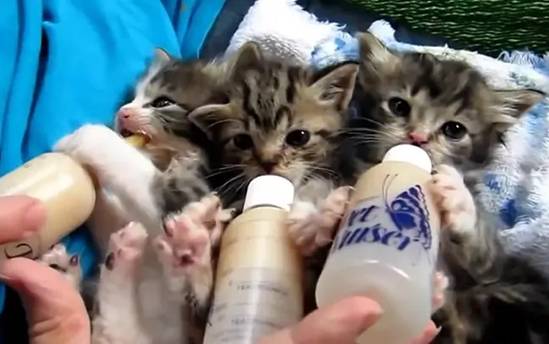 Котенка кормят, держа его вертикально, если он совсем мал, или лежа на животе. Категорически нельзя укладывать котенка на спину. Котята должны сами сосать бутылочку или носик шприца, заливать в них смесь недопустимо – она может попасть в дыхательные пути.
