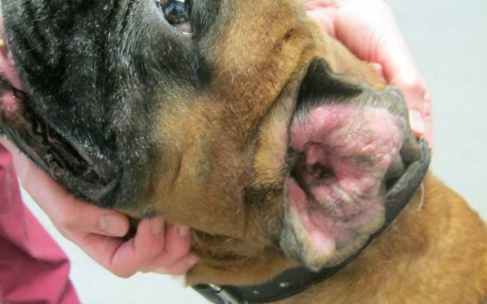 Достаточно частая проблема у собак. Можно наблюдать такие симптомы, как покраснение, отечность, зуд. Если собака начинает постоянно чесаться, то часто происходит занесение инфекции, вследствие чего появляются гнойные выделения, плохой запах и начинает шелушиться кожа.