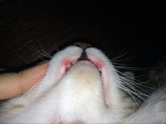 Осмотрев ротовую полость своей кошки, можно увидеть покраснения и отек десен.