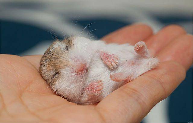 Хомяки рождаются лысыми и слепыми. Шерсть у них появляется в конце первой недели жизни, а еще через неделю они открывают глаза. Прикасаться к новорожденным хомякам нельзя: чужой запах моет заставить самку отвергнуть потомство и даже уничтожить детенышей.