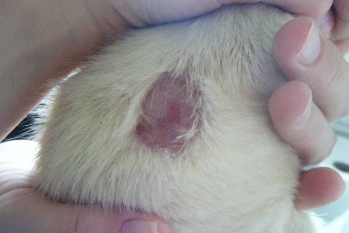 - Стригущий лишай. При этом заболевании болячки имеют характерный вид. Это не сыпь или узелки, а пятна с оголенной кожей розоватого оттенка, которые со временем покрываются корками коричневого цвета. Они могут отпадать, когда животное чешет пораженное место. В результате рана становится мокрой и может кровоточить, причиняя дискомфорт питомцу. Стригущий лишай быстро распространяется, охватывая все большие участки кожи. Это заболевание также известно как дерматофитоз (грибы-дерматофиты вызывают эту болезнь).