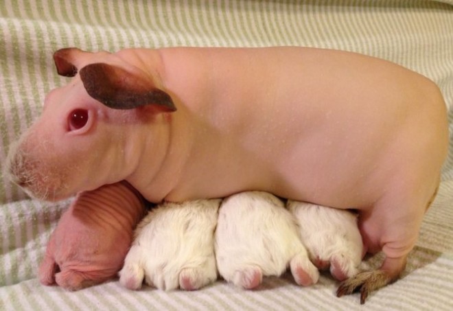 Эти восхитительные поросята «без шубки» не могут быть найдены в дикой природе, так как они возникли благодаря искусственному разведению. Забавные маленькие существа появились в результате мутации в 1970-х годах в Институте имени Арманда Фраппьера, который расположен в Монреале, Канада.