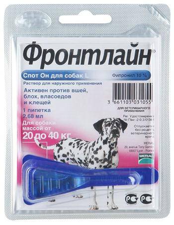 Капли «Фронтлайн Спот Он L» созданы для обработки собак весом 20-40 кг и представляют собой бесцветную жидкость с незначительным запахом. Они эффективны в отношении эктопаразитов, хейлетиеллы и возбудителя ушной чесотки. Средство вызывает паралич вредителя и его гибель. В качестве активного вещества используется фипронил (10%) с ярким контактным инсекто-акарицидным действием. Форма выпуска – флакон-капельница на 2,68 мл.