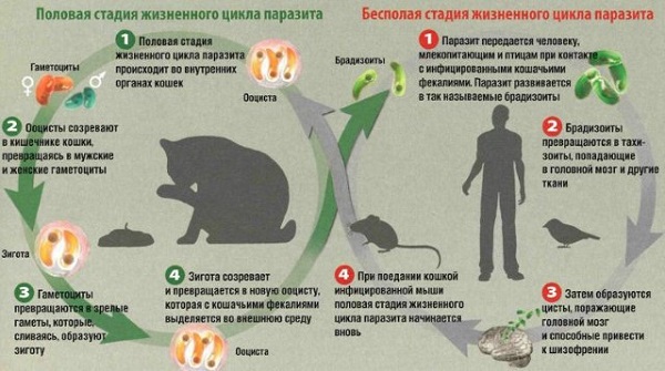 Цикл жизни паразита: Токсоплазмоз вызывается простейшим организмом Toxoplasma gondii. Кошки являются единственными окончательными хозяевами этого паразита, в организме которых он может размножаться. Паразит выделяется с фекалиями кошек, и при попадании в окружающую среду может инфицировать других животных и людей.