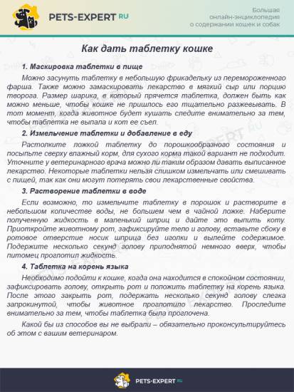 Препарат можно давать, смешивая с кормом, однако кошки очень чувствительны к новым запахам и могут отказаться от привычной пищи. Поэтому наиболее эффективным способом является введение таблетки непосредственно в рот, лучше всего предварительно растворив ее в небольшом объеме воды и выпоив с помощью шприца без иглы. Это гарантирует, что нужная доза лекарства попадет в организм вашего питомца.
