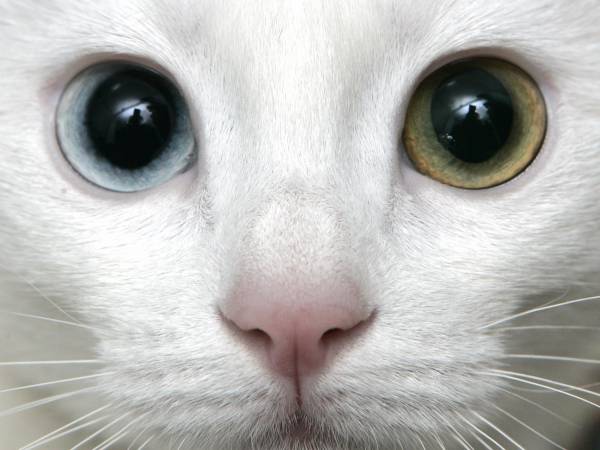 Порода кошек Турецкий ван имеет клинообразную форму головы, средней длины нос розового цвета на кончике, среднего размера уши. Глаза могут иметь как медный или янтарный, так и голубой цвет. Зачастую можно встретить котов с разными цветами глаз (пример – фото кошки справа).