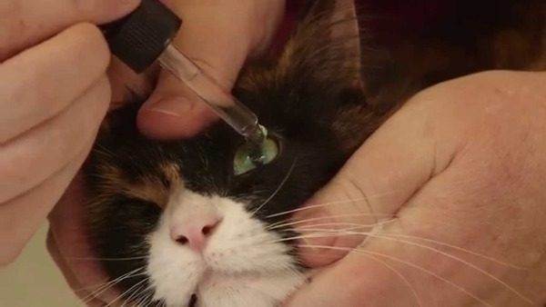 Нижнее веко немного оттягивают большим пальцем, зафиксировав голову кота, чтобы он не дёрнулся. Флакон держат на расстоянии 1 см от глазного яблока, капельница не должна касаться века. Вводят нужное количество раствора в образовавшийся карман. Далее то же самое проделывают со вторым глазом.