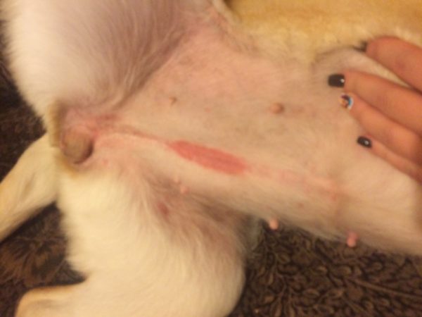 Помимо общих проявлений, свойственных болезни, на теле собаки появляются красные пятна. Покраснения наблюдаются преимущественно на бедрах, брюшине и ушных раковинах.