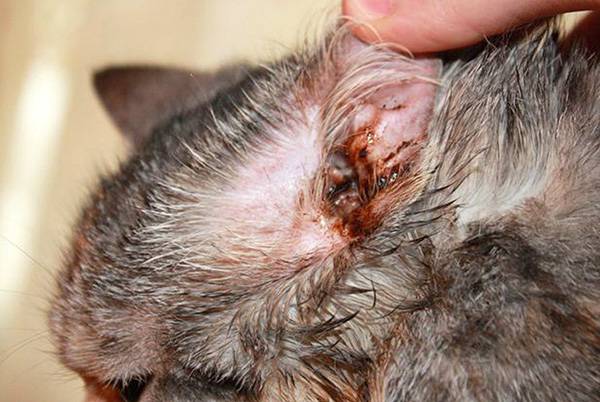- Сильный зуд, который провоцирует животное расчесывать больное ухо до крови;