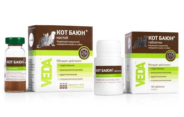 Успокоительные препараты для кошек часто выпускаются только на основе трав. Кот Баюн содержит список из 17 растений. В комплексе они оказывают длительный седативный эффект. Производитель обещает, что за 5-7 дней у кота стабилизируется состояние психики. Препарат рекомендуется к применению 3-4 раза в день.