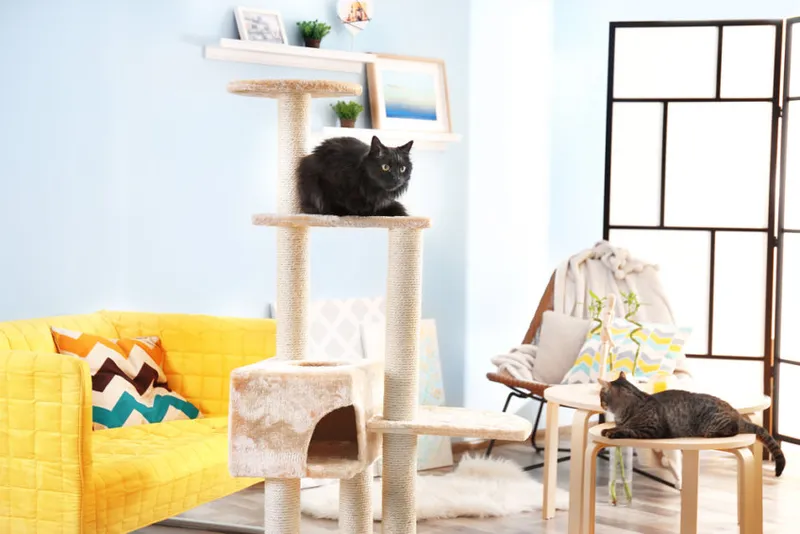 Как сделать кошку счастливой? Если у вас небольшая площадь, попробуйте расширить пространство вверх. Поставьте когтеточку, установите полку, позвольте кошке устроить себе постель на комоде. Идеальная идея – это так называемый кошачьи деревья с множеством сидячих мест, желательно расположенные на разных уровнях. Кошки любят смотреть на все сверху. Это заставляет их чувствовать себя в большей безопасности. И, как мы знаем, это дает им ощущение стабильности – основы кошачьего счастья и мира.