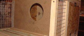 Гнездо выполняется вставным. В одной из стенок устанавливается откидная дверца, сделанная из деревянной рамы, обитой металлической сеткой. Ясли также изготавливаются из сетки, но с более крупными ячейками: 35х35 мм. Домик располагается на высоте 70 см от пола, устанавливая его на ножках или козлах.