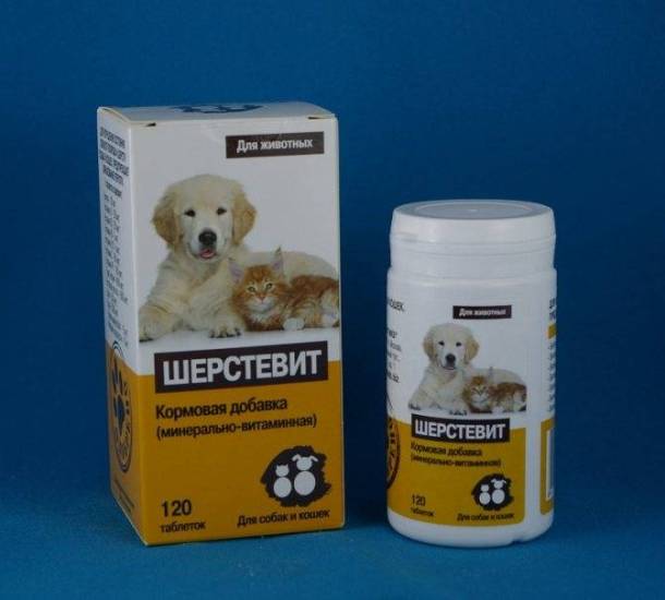 - Шерстевит. В его состав входят витамин В1, биомин, лизин, метионин и другие компоненты. Препарат нормализует обмен веществ в организме животного, смягчает стрессовые реакции на внешние факторы, стимулирует рост шерсти и предотвращает её выпадение. Морские водоросли, входящие в состав Шерстевита, улучшают работу эндокринной системы и повышают защитные функции организма.