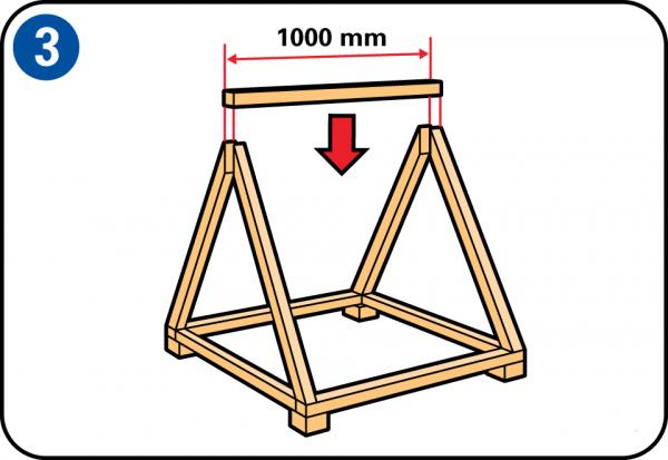 После этого приступите к сборке рамы, соединяя две А-образные конструкции с деревянной планкой длиной 120 см, которая будет служить краем крыши. Убедитесь, что треугольные элементы правильно выровнены.