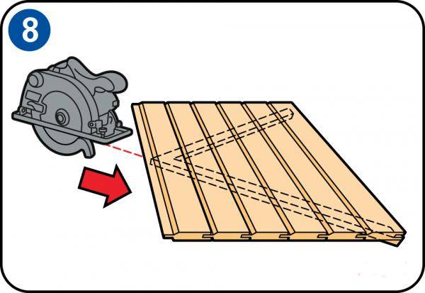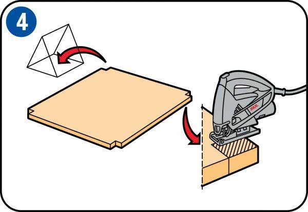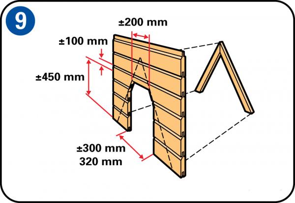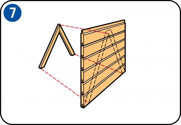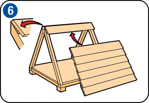 Нарисуйте диагональную линию крыши от центральной точки до вершины шестой доски. С помощью циркулярной пилы вырежьте заднюю стенку, придав ей ту же треугольную форму, что и А-образная рама, и закрепите ее на месте.