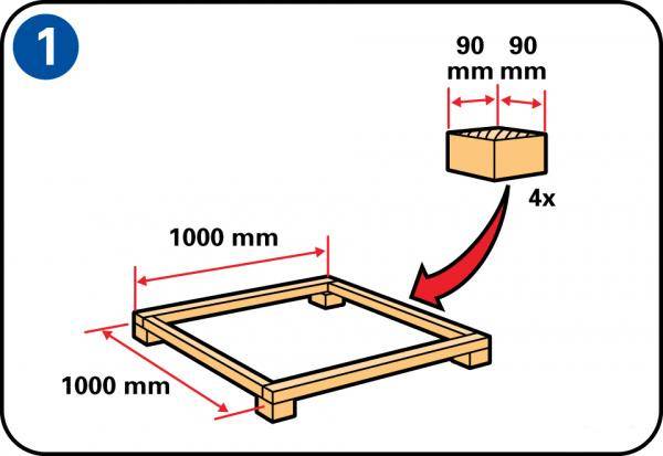 Соберите рамку, используя четыре деревянных бруска размером 44×44 мм. Закрепите четыре деревянных элемента в углах рамки так, чтобы они не соприкасались с землей.