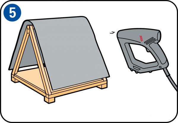 Если вы стремитесь обеспечить полную водонепроницаемость крыши вашей конуры, начните с обертывания А-образной рамы плотной полиэтиленовой пленкой и надежного закрепления ее с помощью скоб. После этого переходите к установке крыши конуры.