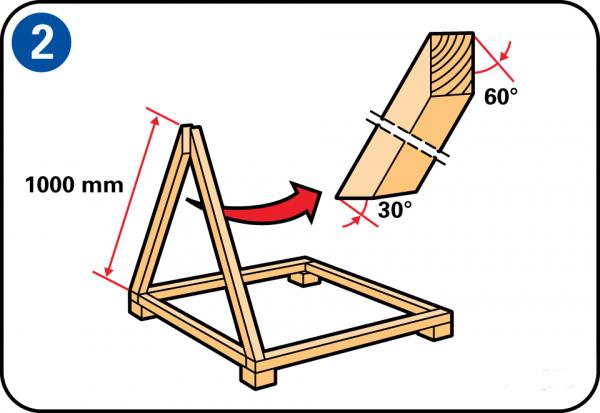 Соберите раму для конуры треугольной формы. Отрежьте нижнюю часть треугольника под углом 60 градусов, а верхнюю — под углом 30 градусов. Затем закрепите нижние углы деревянных деталей оцинкованными (или из нержавеющей стали) шурупами.