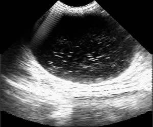 Наполнение толстой кишки изменяет форму мочевого пузыря, а ее содержимое, как бы впячиваясь в полость пузыря, отбрасывает дистальную тень, и тем самым провоцирует возникновение артефакта – «конкремент в мочевом пузыре», поэтому в сомнительных случаях требуется повторная ультразвуковая диагностика. Острые воспалительные процессы сопровождаются, как правило, выраженным и неравномерным утолщением стенок мочевого пузыря, а также хлопьевидным осадком (Эхограмма 8).