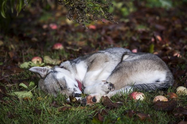 Западносибирская лайка сладко спит в тени под яблоней после хорошей прогулки
