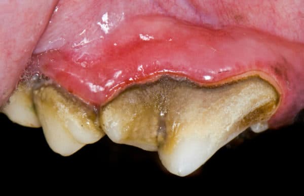 – при осмотре ротовой полости на зубах визуализируются плотные отложения от светло-желтого до темно-коричневого цвета, десна в данных местах как правило гипперемированы в следствии воспаления и травмирования зубным камнем.