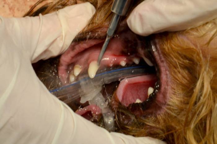 По окончании процедуры заранее приготовленными шариками ваты, смоченными в перекиси, обрабатываем десны собаки, поскольку во время обработки они могут кровоточить. После этого десны обрабатывают аптечным раствором Люголя. Запущенные случаи зубного камня удаляются ветеринаром в стоматологической клинике с применением общего наркоза, но желательно не допускать до такого состояния и регулярно санировать полость рта животного.